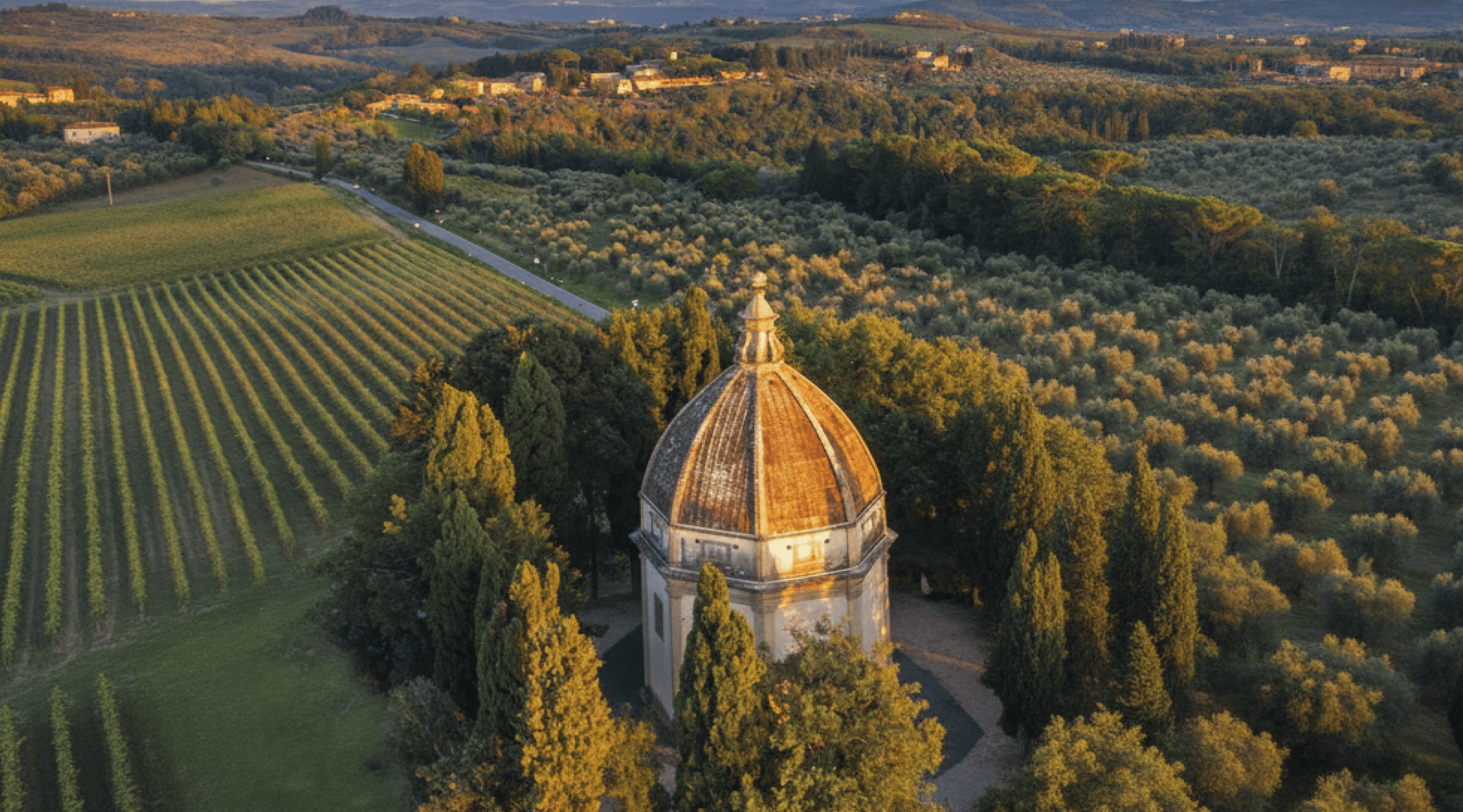 Surrounded by gentle slopes, vineyards, and ancient farmsteads, the Dome of Semifonte stands like a watchtower over the Val d’Elsa. Its perfect geometry contrasts with the softness of the surrounding hills, creating one of the region’s most symbolic panoramas. Here, the past is not distant: it lives in the silence of the fields, in the horizon shaped by generations, and in the profound sense of place that defines these lands.